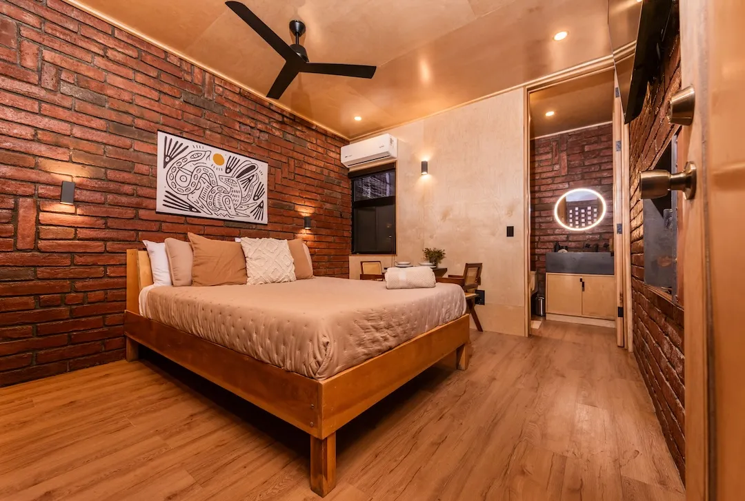 Está equipada con cama queen, cama twin, ventilador, mesita con dos sillas, calentón, baño completo con agua caliente, estufa de dos hornillas, refrigerador, lavaplatos y utensilios para cocinar. Tiene aire acondicionado, WiFi satelital, televisión y dish network. En el exterior cuenta con alberca privada climatizada, dos sombrillas, dos camastros, asador, hoguera y banca.